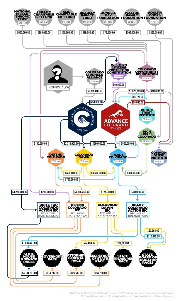 After various additional rinses, millions of dollars flowed out of the section 501 portion of the network into the Colorado campaign finance system in the form of four independent expenditure committees, or IECs. IECs are Colorado’s version of a superPAC: they cannot give money to candidates, but they can spend unlimited money in support of candidates. In the case of the Advance network in 2022, four related IECs spent nearly $8 million supporting Republican candidates and causes.