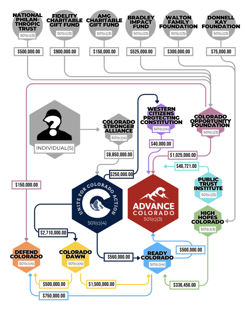 After that, things got complex. The initial $8.85 million received by Unite for Colorado turned into contributions from Unite to a variety of other organizations in the network, including $560,000 to Ready Colorado, and $3 million to a (c)(4) named Colorado Dawn, which was helmed by state board of education member Steve Durham, former state Senator Paul Lundeen, and Fields. Colorado Dawn then gave $1.5 million to Ready Colorado and another $500,000 to a group named Defend Colorado, which Ready Colorado also contributed $750,000 to. Meanwhile, Defend Colorado also received $150,000 from the Colorado Opportunity Foundation 501(c)(3) which Fields and Kennedy used to bring tax-deductible donor money into the system.