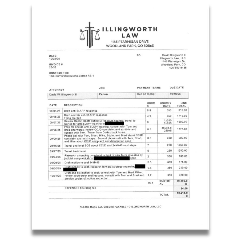In addition to Miller’s invoices, the district has been billed for legal services by Miller allies, like First & Fourteenth – a firm specializing in culture war issues which is currently charging the district for its involvement in a lawsuit against the Colorado High School Activities Association – and Illingworth Law, which is run by a former client of Miller from the Woodland Park school board and represented Burris in his personal legal matters.