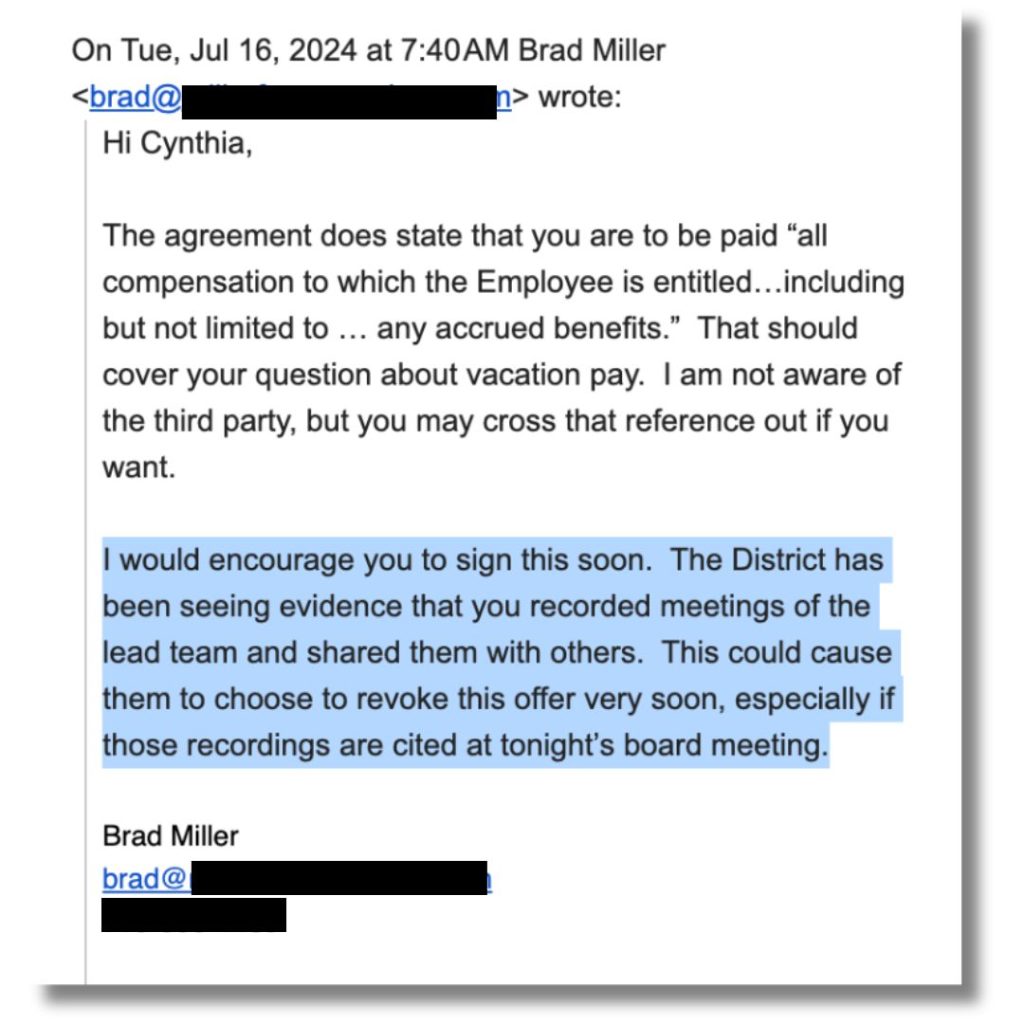 “I would encourage you to sign this soon,” Miller said about the severance deal in an email back-and-forth. “The District has been seeing evidence that you recorded meetings of the lead team and shared them with others. This could cause them to choose to revoke this offer very soon.”