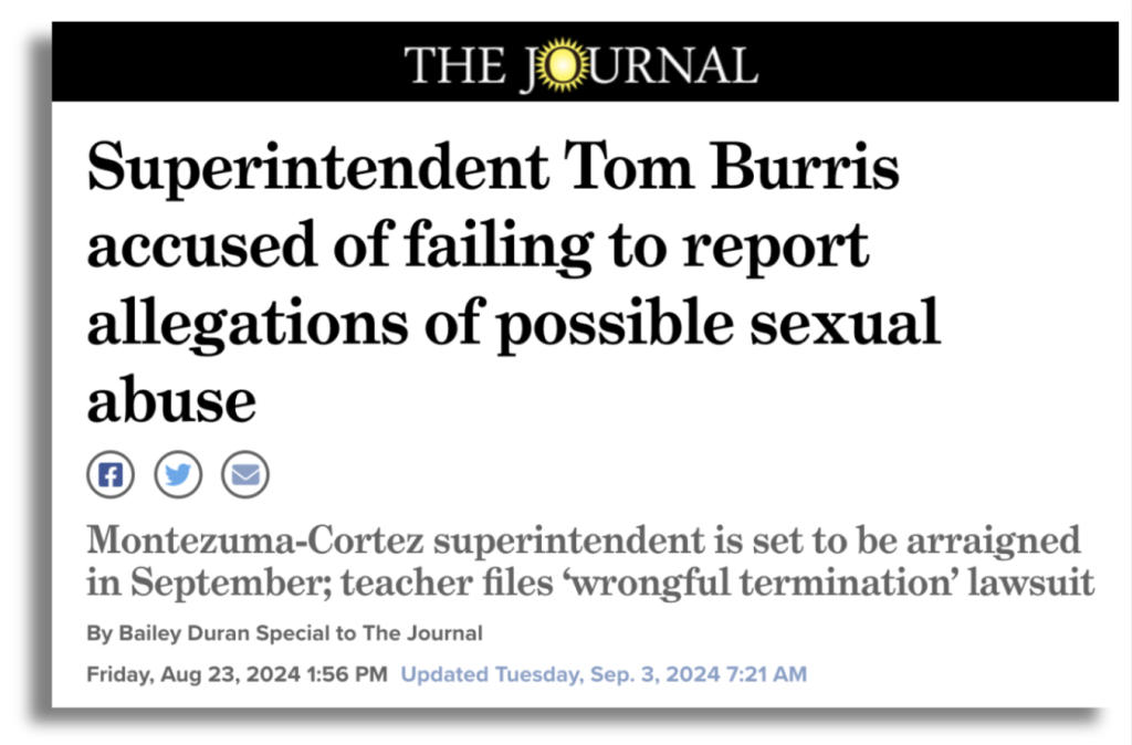 Within two months of that June 13, 2024, phone call, Eldredge had been terminated from her position as the head of human resources for the school district, and Cortez police had opened a criminal investigation into Tom Burris – a new low point for a superintendent whose tenure teachers, parents, former district employees, and community members have told me had already been marked by dysfunction, bullying, and alleged shady dealings.