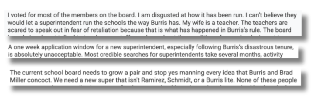 “The current school board needs to grow a pair and stop yes-manning every idea that Burris and Brad Miller concoct,” said one response. In response to a question about what values they wanted to see represented in the role of superintendent, one community member replied simply, “Nobody affiliated with the Brad Miller group.”