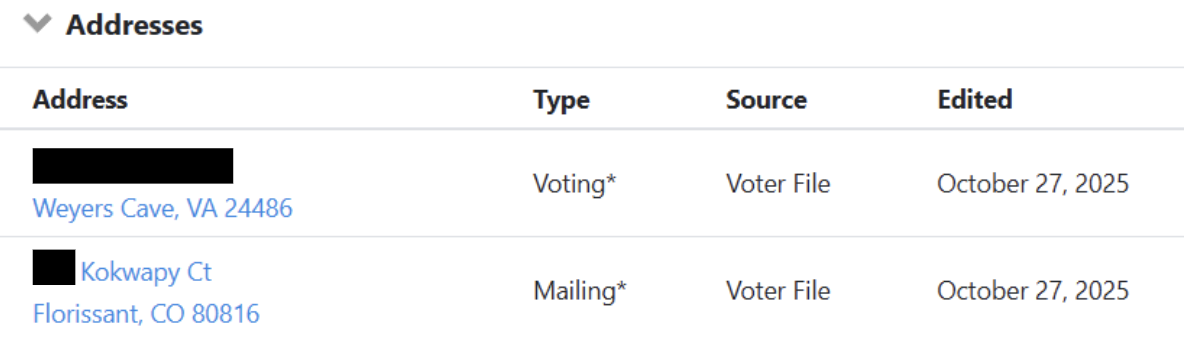 According to records from the Voter Activation Network, or VAN, Patterson – who was previously registered to vote in Florissant – is currently registered to vote in Weyers Cave, Virginia. Records also show that the mailing address attached to her voter file, necessary for anyone intending to cast an absentee ballot, was updated two days ago. On October 27, 2025, her voter file was updated to show a voting address in Weyers Cave, but a mailing address in Florissant.