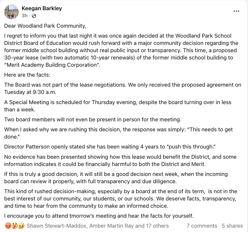 “I regret to inform you that last night it was once again decided that the Woodland Park School District Board of Education would rush forward with a major community decision regarding the former middle school building without real public input or transparency,” Board member Keegan Barkley posted on Facebook. Barkley, elected in 2023, is often the lone vote against the Board majority.