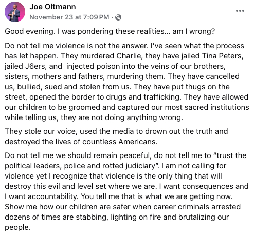 On Nov. 23, Oltmann posted a litany of grievances, including Peters’ incarceration. “Do not tell me violence is not the answer,” he wrote. “I’ve seen what the process has let happen. They murdered Charlie, they have jailed Tina Peters, jailed J6ers, and injected poison into the veins of our brothers, sisters, mothers and fathers, murdering them. They have cancelled us, bullied, sued and stolen from us. They have put thugs on the street, opened the border to drugs and trafficking. They have allowed our children to be groomed and captured our most sacred institutions while telling us, they are not doing anything wrong. They stole our voice, used the media to drown out the truth and destroyed the lives of countless Americans. Do not tell me we should remain peaceful, do not tell me to ‘trust the political leaders, police and rotted judiciary.’ I am not calling for violence yet I recognize that violence is the only thing that will destroy this evil and level set where we are. I want consequences and I want accountability.”