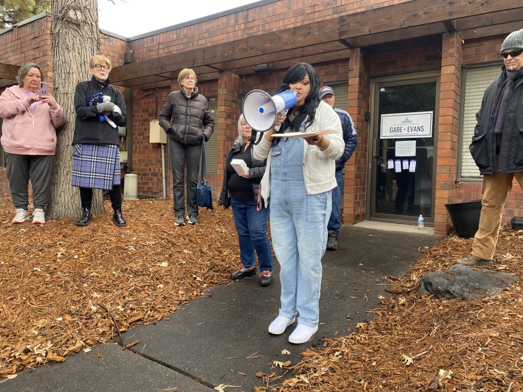 The door to U.S. Rep. Gabe Evans’ (R-CO) office in Greeley was locked Friday morning when Jen Montes, standing in front of 30 people, delivered an envelope full of petitions opposing a proposal to open a jail for immigrants in Evans’ House district.