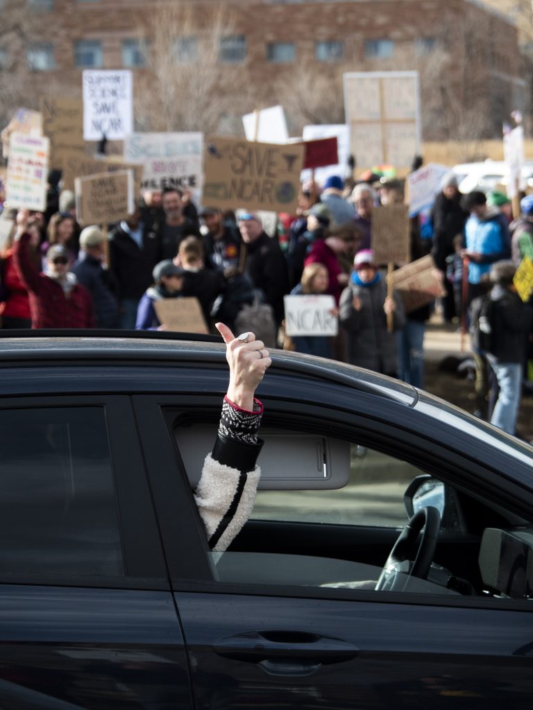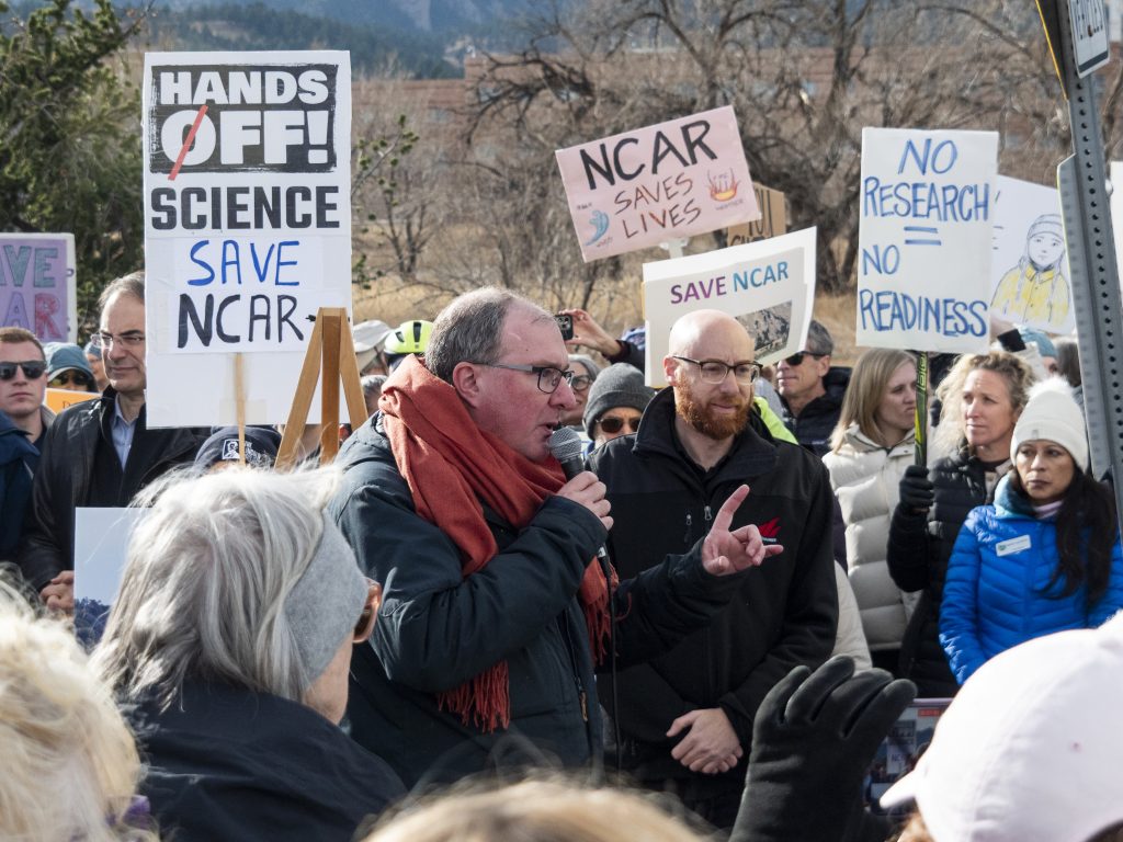 While the rally was organized on short notice, its large turnout included NCAR employees past and present, CU faculty, elected officials, and concerned citizens from across the state. Attendees assembled on Broadway, in front of the David Skaggs Research Center, which houses federal facilities and labs for the National Oceanic and Atmospheric Administration (NOAA), as the location is much more publicly visible than the NCAR facility itself.