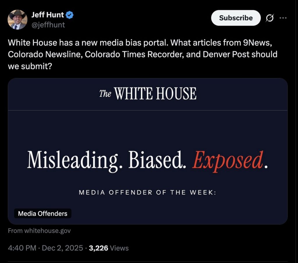 Just last week, right-wing radio host Jeff Hunt asked his followers to suggest Colorado Times Recorder stories he could submit to the Trump administration’s new “Media Offender of the Week” website.