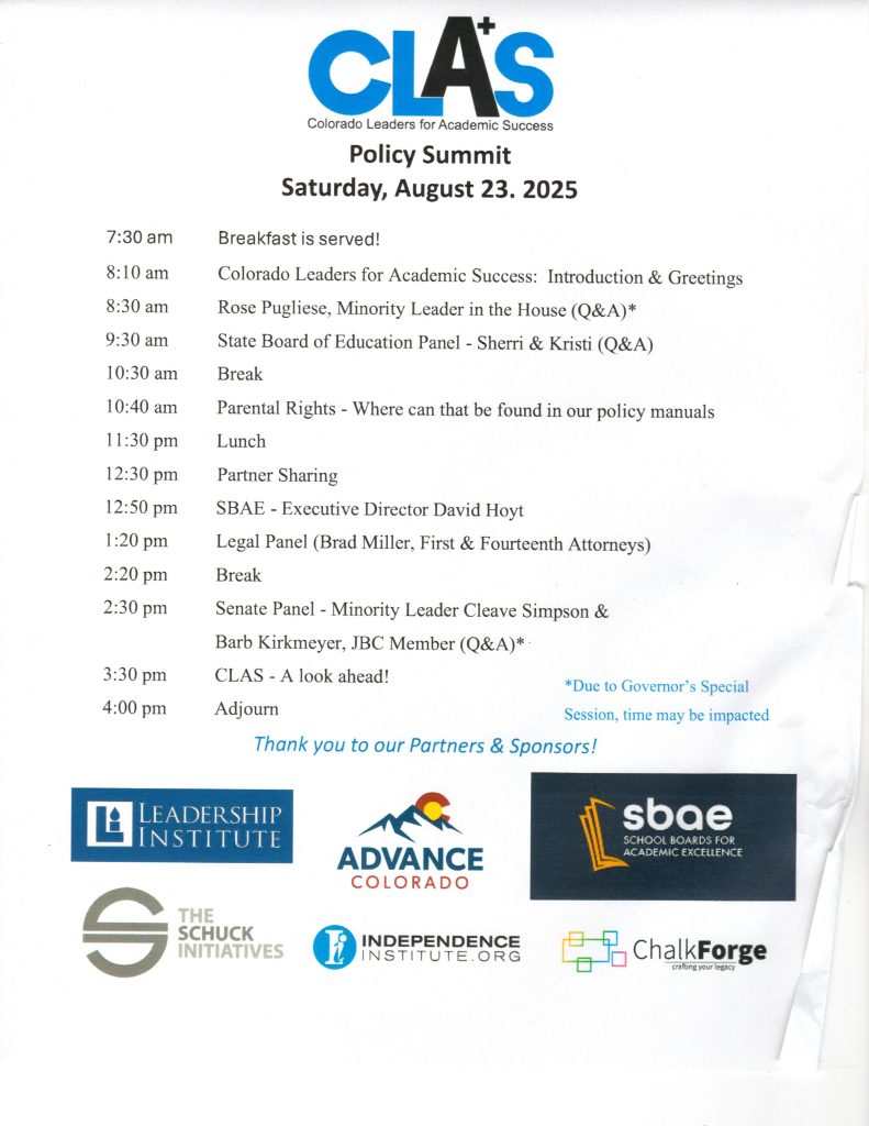 In August, the CLAS policy summit brought together the players who hope to make it happen: school board members, “parents’ rights” activists, statewide elected officials, and the lawyers who will be on the frontlines. Speakers included Kristi Burton Brown, the former executive director of the Colorado Republican Party and a current member of the state board of education, as well as Senate Minority Leader Cleave Simpson, then-House Minority Leader Rose Pugliese, and representatives from national conservative organizations like the Leadership Institute and School Boards for Academic Excellence. Republican state Senator and gubernatorial candidate Barbara Kirkmeyer was also billed as a speaker. A handout obtained at the event lists Colorado conservative organizations like the Independence Institute and Advance Colorado as “partners and sponsors” of the event.