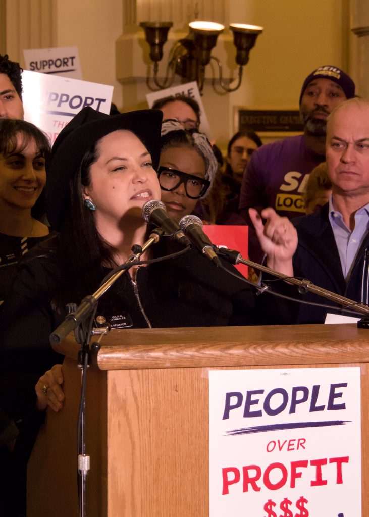 “Look, we know that our dear governor, a centi-millionaire, has demonstrated incredible class solidarity with his veto of the Worker Protection Act in 2025, but we also know that the power of working people across this state is unstoppable,” said Gonzalez. “And so I cannot wait to see this bill come back, and I cannot wait to see a governor who will sign this bill into law.”