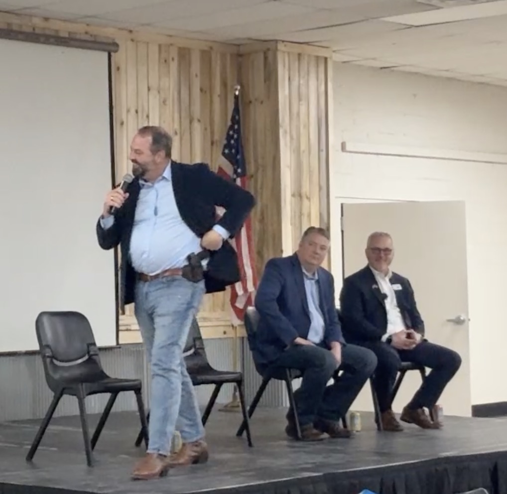 Four candidates took the stage at Kirk Hall on the Douglas County Fairgrounds: state Rep. Scott Bottoms, Teller County Sheriff Jason Mikesell, podcaster Joe Oltmann and Army veteran Jason Clark. The $25-per-plate event drew roughly 150 attendees for an evening of pizza, a firearm auction, and pitches from candidates seeking to lead Colorado.