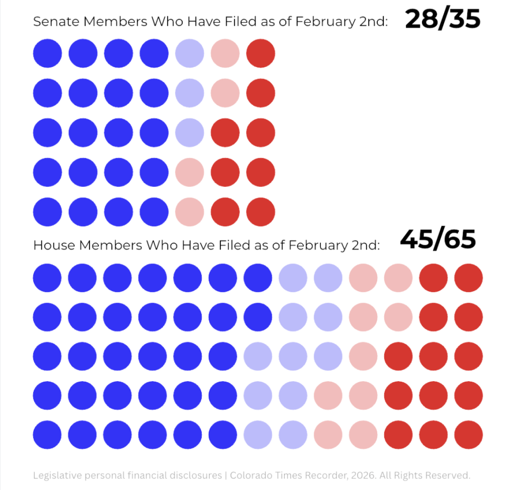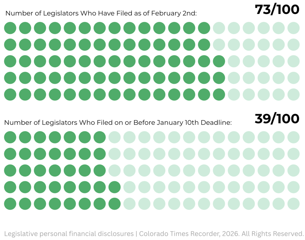Of the eight members of legislative leadership – two per party per chamber – only two of them submitted this year’s disclosure form on time: state House Speaker Pro Tempore, Rep. Andrew Boesenecker, and state Senate President Pro Tempore, Sen. Dafna Michaelson-Jenet.
