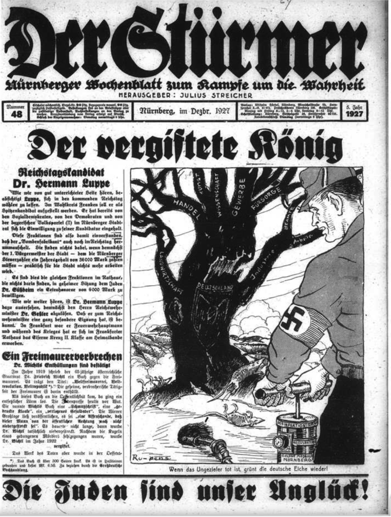 Der Stürmer, one of the most virulently antisemitic publications in the 20th Century, began publishing in Germany in 1923—fully a decade before the Nazi party seized control of the state. Founded by Julius Streicher, it was dedicated almost exclusively to spreading racist and antisemitic propaganda, popularizing the Jews-as-rats imagery. A famous example of this was on the cover of the publication from Dec. 5, 1927. The image depicts an exterminator wearing a swastika armband, using poison gas to kill rats representing Jews around an oak tree. The rats are labeled “the press,” “stock exchanges,”and “trusts.” Each branch of the tree, which is labeled “Germany,” is labeled “workers,” “agriculture,” “industry, “arts,” “commerce,” and other business sectors. The headline translates to “The Poisoned Ronig (a common Jewish surname).” The subhead at the bottom of the page translates to, “The Jews are our misfortune,” and the caption translates to: “When the vermin are dead, the German oak will bloom again.”