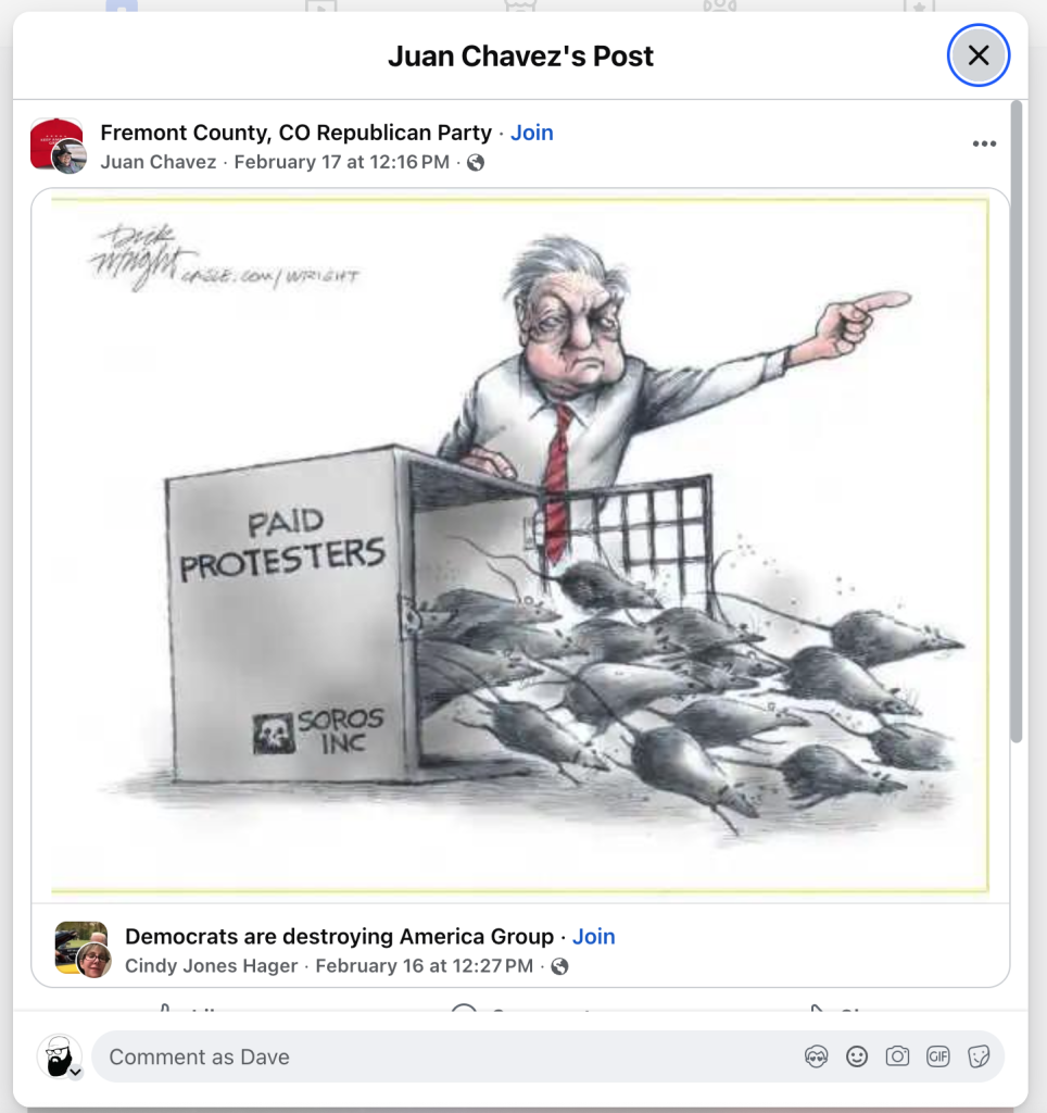 On Feb. 7, an individual named “Juan Chavez” posted a political cartoon in the open-to-the-public Fremont County, CO Republicans Facebook group. It depicts George Soros—a favorite Jewish Boogeyman of the Republican party, given his enormous financial contributions to left-wing causes—freeing an army of rats from a box labeled “paid protestors” and “Soros Inc.”